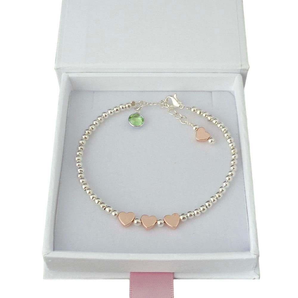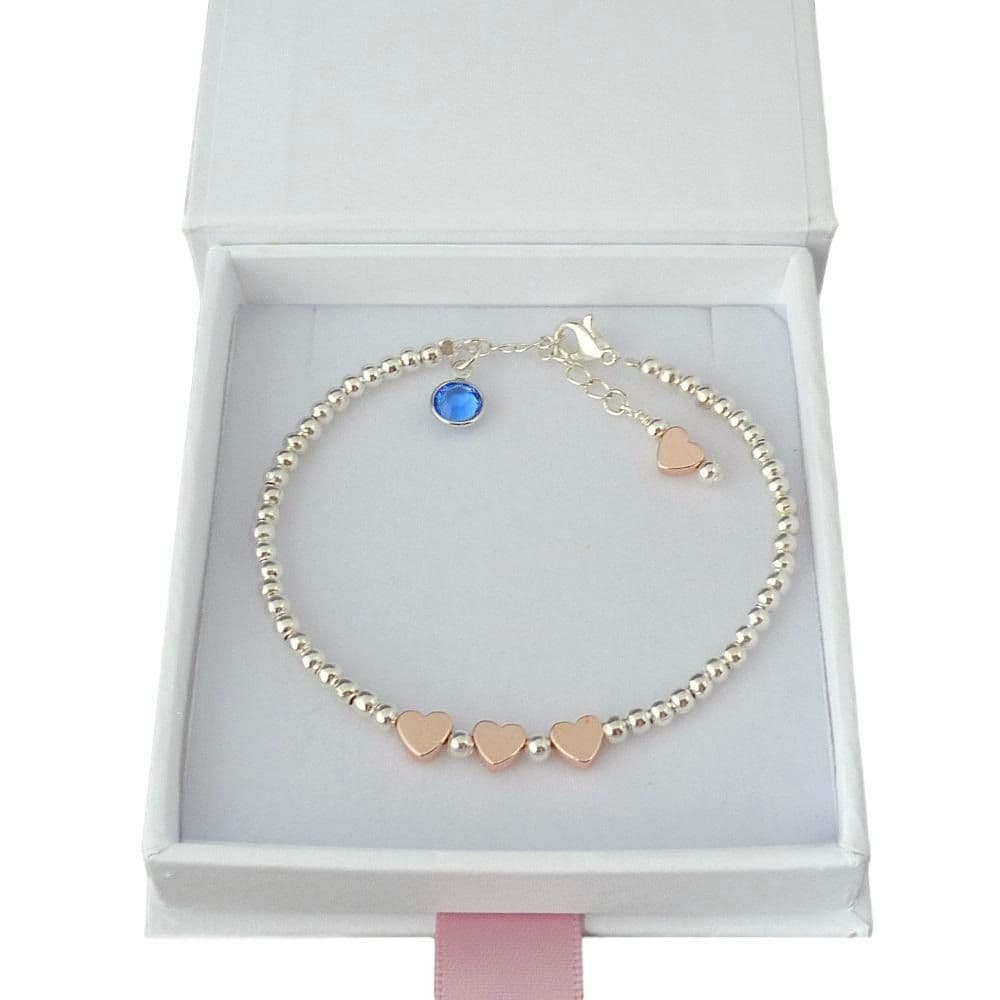 A modern twist on the Birthstone Bracelet made with mixed metals and featuring three rose gold hearts across the centre. Supplied on your choice of card mount (Daughter, Nanny, Mummy, Niece, Auntie, Bridesmaid, Flower Girl etc). Featuring a single sparkling Preciosa crystal birthstone hanging by the clasp.