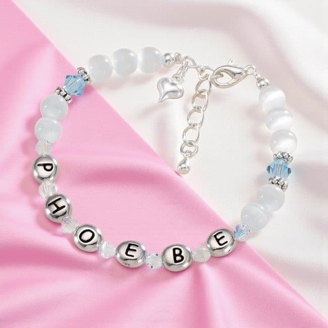 Handmade by us with stunning white 'cat's eye beads' and sparkling, high grade Preciosa crystals we can make any size to fit any girls wrist.