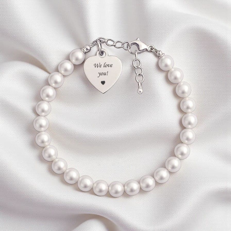Perfect, you have found a Special girl's first pearls! This personalised pearl bracelet features an engraved heart charm. Made to order in our UK workshops with beautiful Preciosa pearls in your choice of many colours. The heart is of high quality, tarnish proof, stainless steel, we offer free engraving on the heart charm enhancing such a special gift from a loving parent, grandparent, godparent or someone close to the lucky girl.