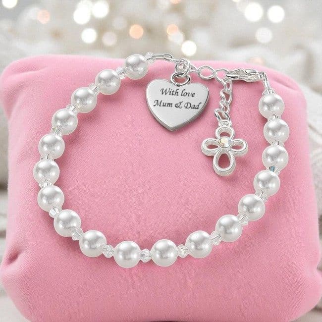This lovely white pearl bracelet for First Holy Communion is personalised with an engraved heart and a cross charm, it is a great choice as a keepsake gift on any girls first holy communion day. It can be personalised with engraving of any words, names, dates or messages. Each bracelet is size adjustable for a perfect fit on any girls wrist and to enable the bracelet size to be increased as a younger girl grows up.