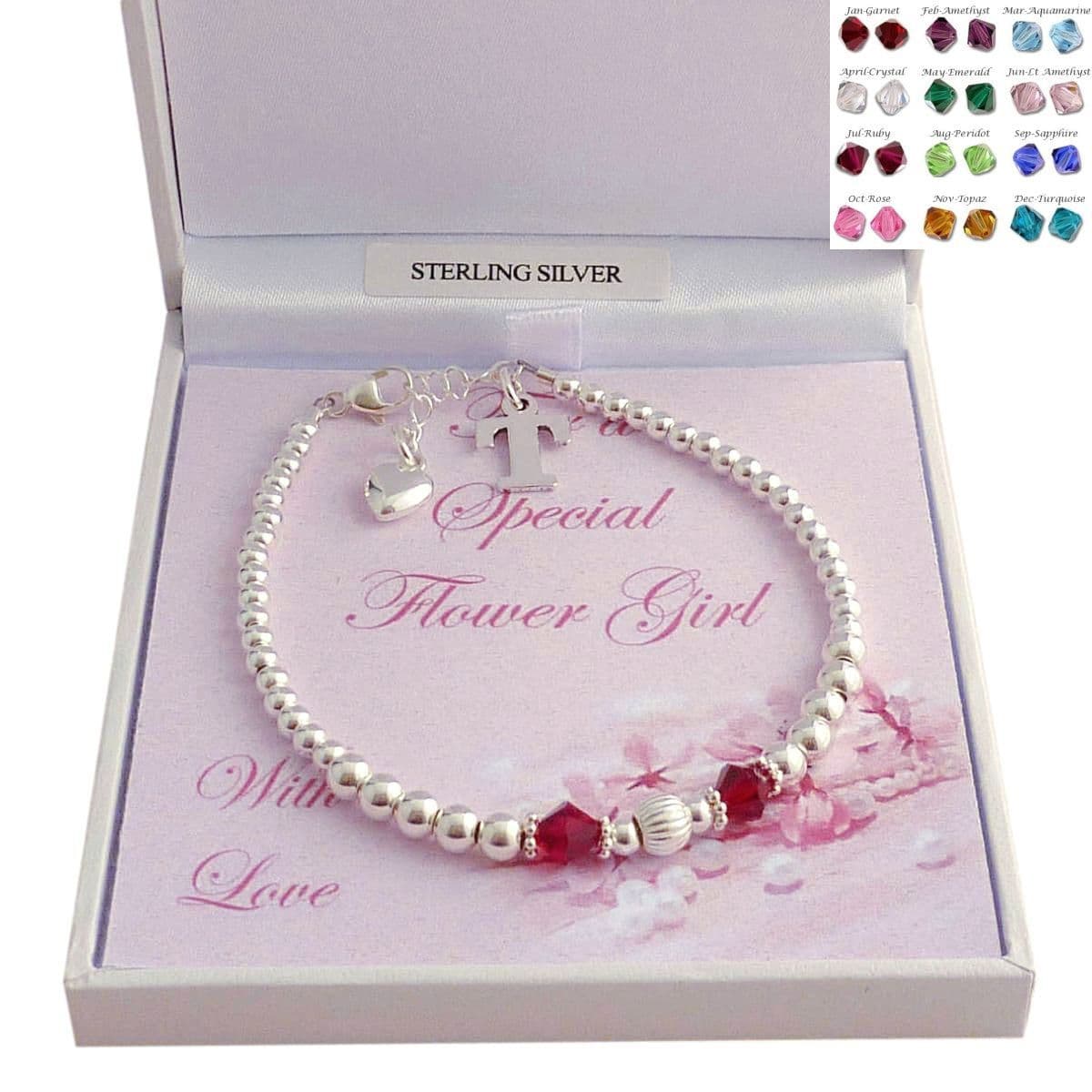 An elegant design, this Sterling silver Flower Girl, Maid of Honour or Bridesmaid bracelet with choice of letter charm & birthstones is beautifully presented in the gift box shown with Special Maid of Honour, Special Bridesmaid or Special Flower Girl card mount to make a lovely thank you present for a bridesmaid or flower girl to wear and to keep. Choose any sterling silver letter charm to go on the bracelet. All letters are in stock and ready to ship!
