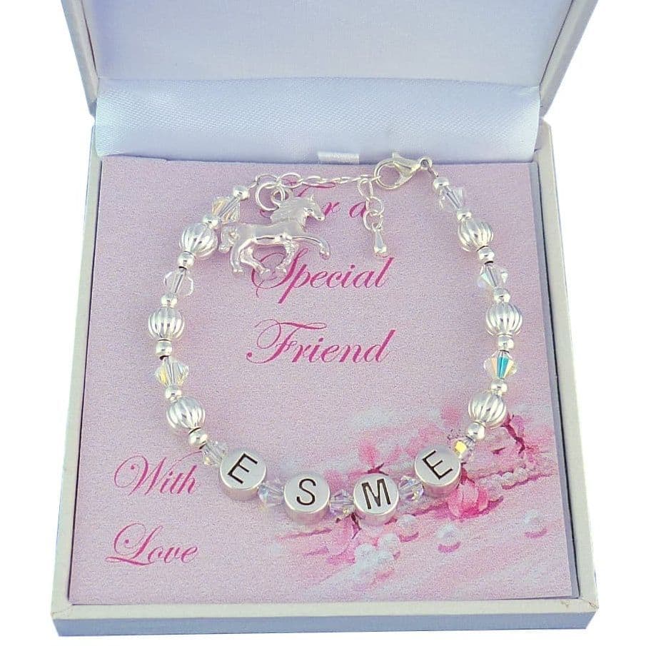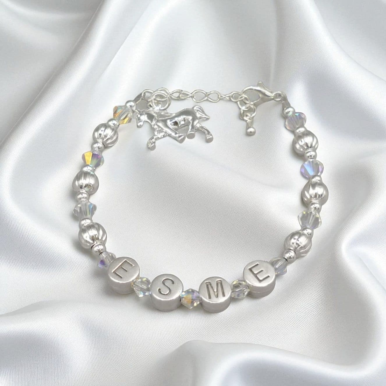 This sparkly bracelet, shown here with horse charm can be made with any girls name and with your choice of charm by the clasp.