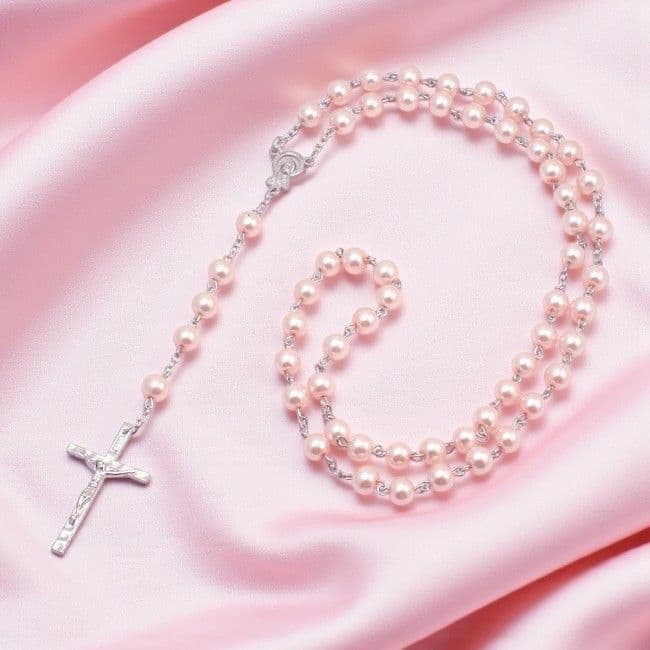 This lovely affordable rosary is made with beautiful, high quality glass pearls. Various colours including white are available, perfect for so many occasions including: First Holy Communion, Christening, Confirmation, Baptism or Wedding. Supplied in an organza gift pouch with the free gift card where you can add your own personal message.