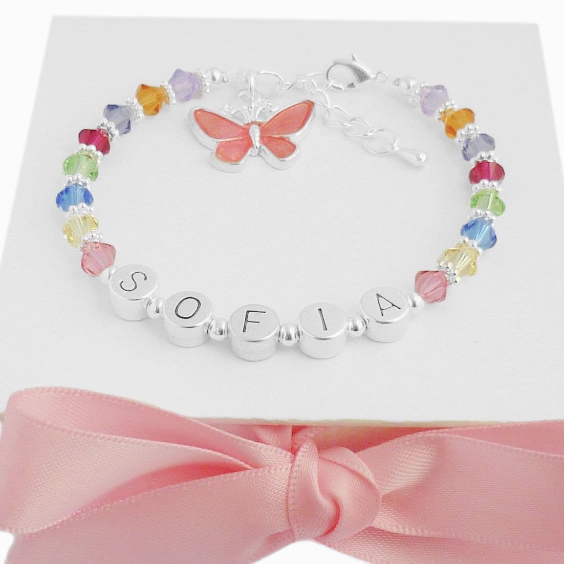 Girls personalised name bracelet in special gift box for Daughter, Granddaughter, Goddaughter etc. This lovely multicoloured bracelet features a pretty butterfly charm can be made with any girls name.