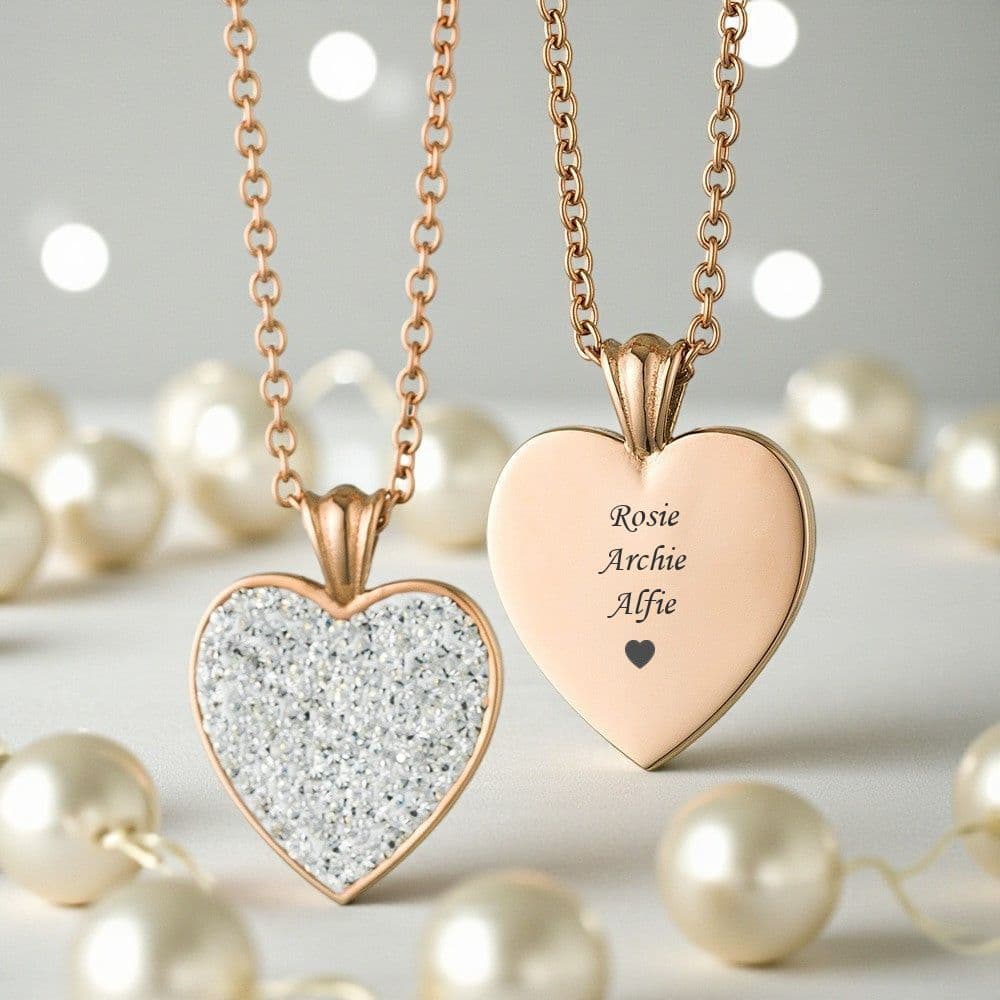 Beautifully engraved, this rose gold heart necklace features multiple Czech crystals on the front and is personalised with any engraving on the back.